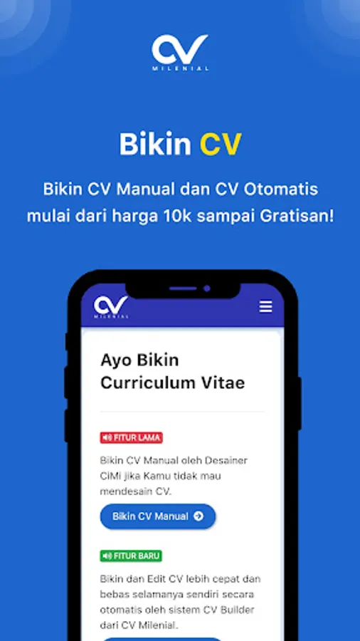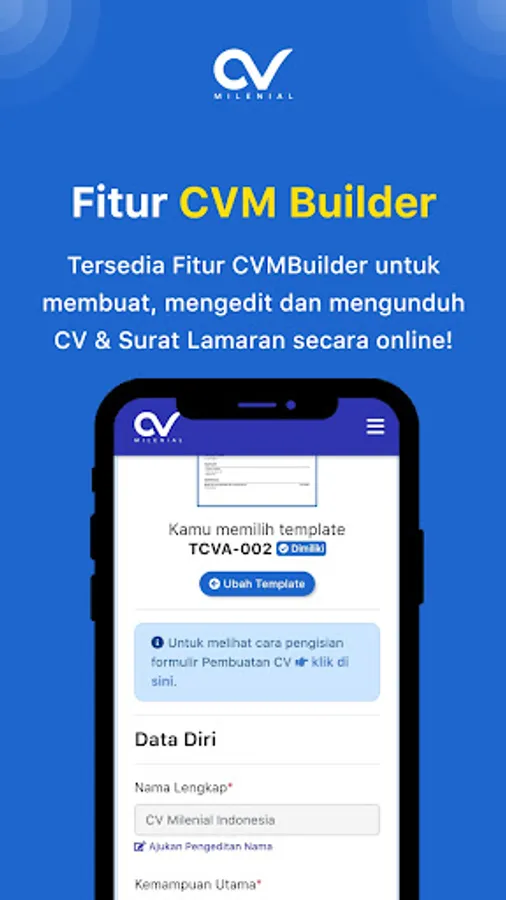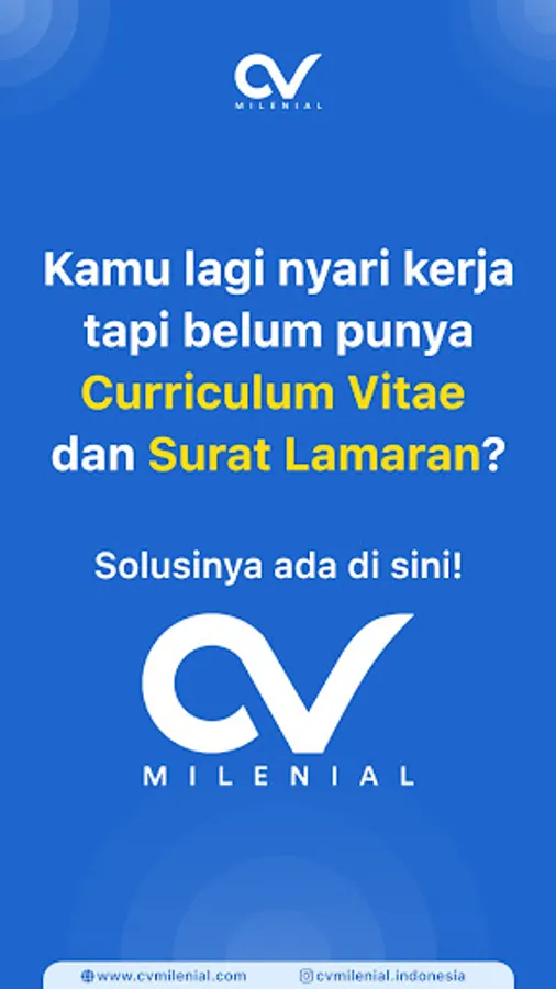 CV Millennial is a CV (Curriculum Vitae) Making Platform or Curriculum Vitae and Job Application Letters that are easy, fast, practical and can be managed online, you only need to fill in the data completely and the CV / Application Letter can be downloaded in PDF form.