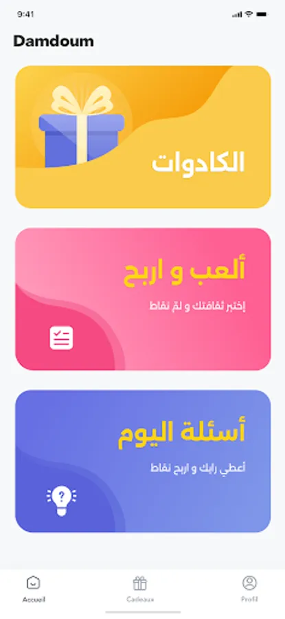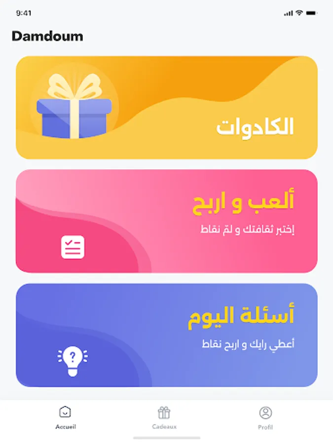 Damdoum is the educational and fun quiz app that lets you play while you learn. It offers a variety of quizzes to test your knowledge on topics such as history, general knowledge, sports and much more! Play quizzes, take surveys, earn points and exclusive rewards like vouchers. Download it now and start playing!