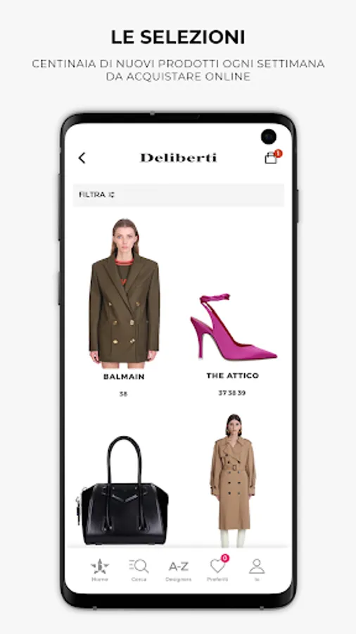 - filtering options for designers, categories, sizes and colors;