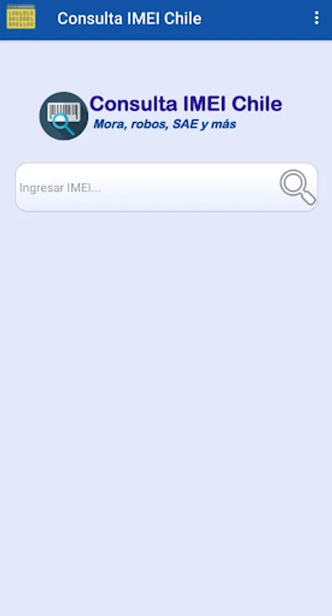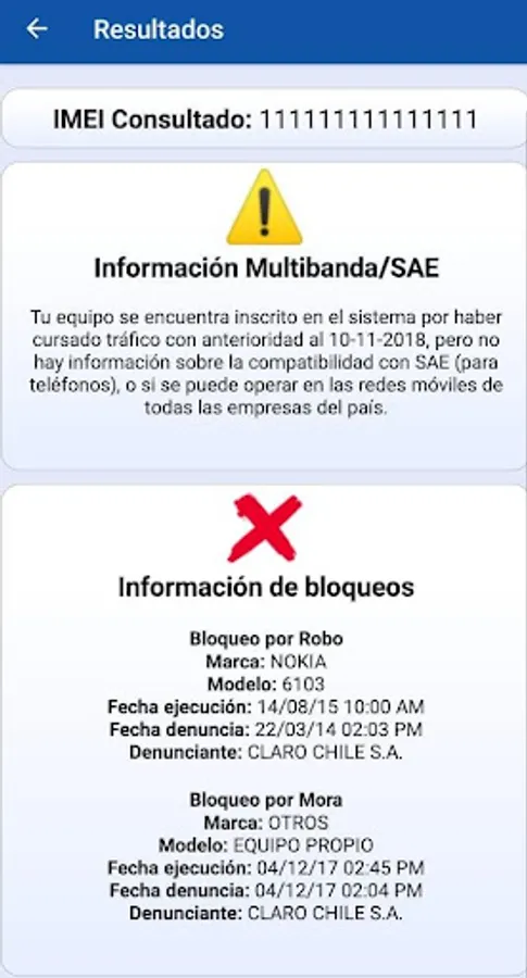 IMEI Chile Consultation has a quick search modality where we only have to add the IMEI that we want to consult so that we can immediately consult and find out the health status of this whether it is blocked or not, in case that an active block is present, the APP is able to show the reason for the block and in which company it was applied.