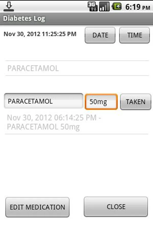 The two fields, Medication and Dose are next to the TAKEN button. These come from the prespcription.