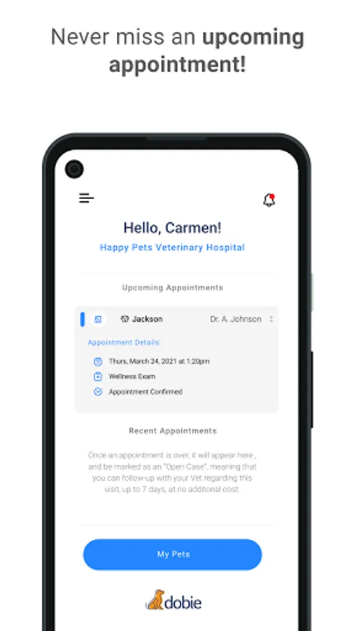 Dobie brings YOUR trusted vet and vet clinic at your fingertips. No more phone calls, emails and waiting times. You are now connected to the digital version of your vet clinic, right from the comfort of your home! From there you can schedule appointments for your pets, look up your pet's health records and previous appointment notes, review your furry friend's vaccine history, and so much more!