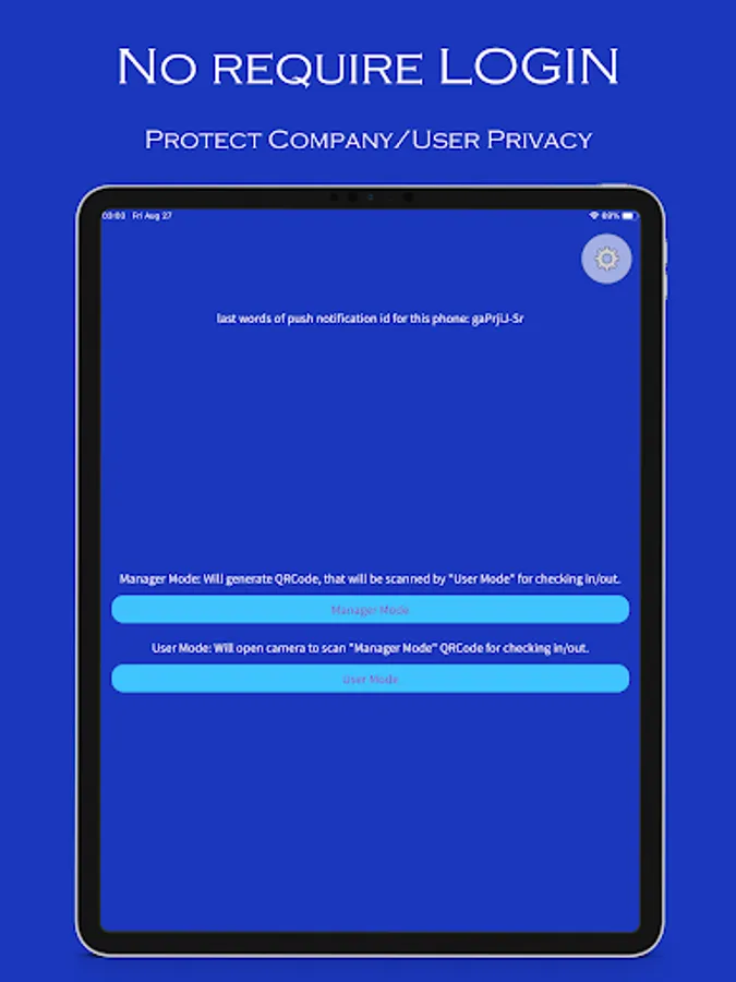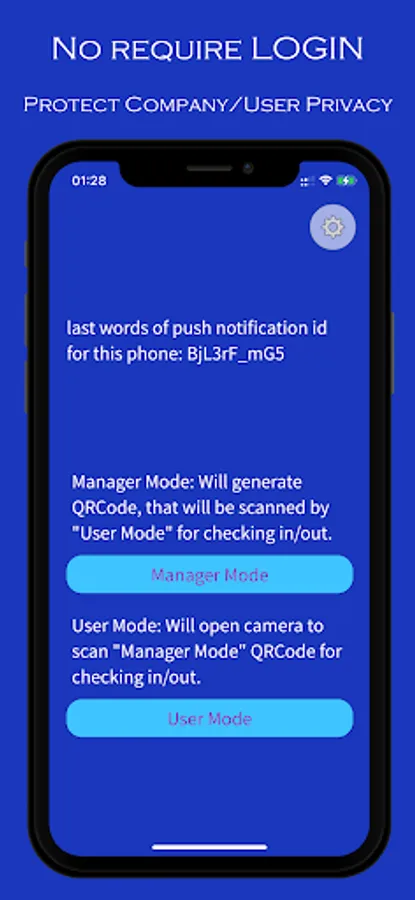 This service does not require registration, but use push notification number for identification. Suitable for small company/class to record attendance check in/out. Manager and User all can keep one record for verification each other, this record can export as CSV file.