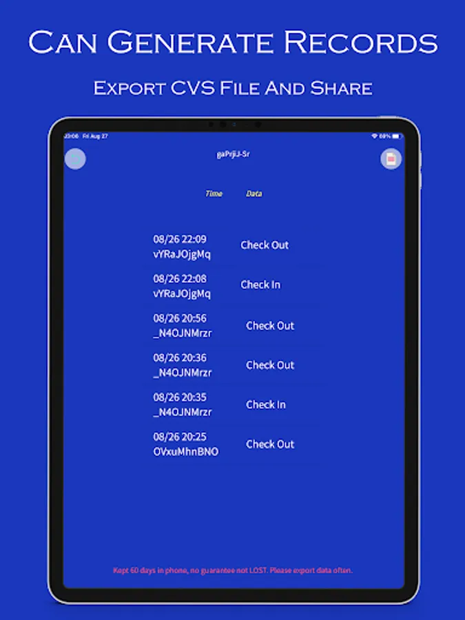 Warning: Records will be kept 60 days in phone. BUT, no guarantee not LOST. Please export data often, daily will be better. Especially when the mobile phone is changed, the App is reinstalled, and the data is manually deleted, the data will be lost, and the identify number will also be changed.