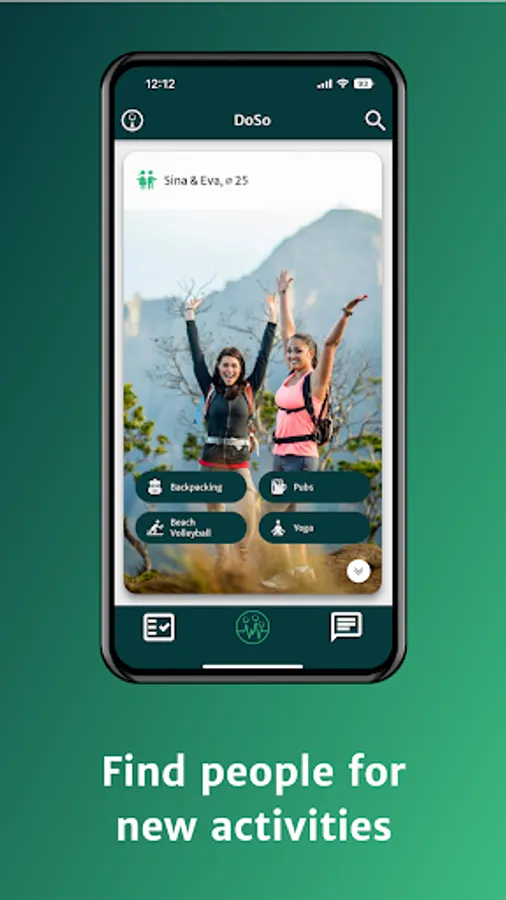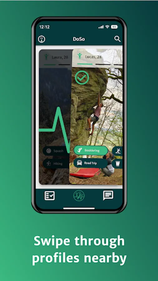 We swipe activities, not people. This means that contacts are made by sending and accepting activity requests. Every swipe to the right is an activity request, that can be accepted or declined in the request area. At DoSo, your safety comes first, which is why you decide who you chat with.