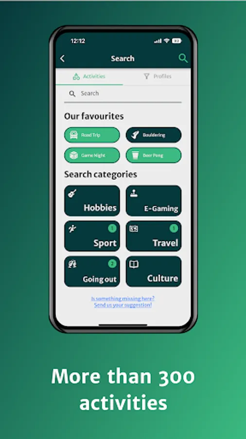 Swipe activities, find people & do something together! With the intuitive swipe function, you can easily go through the profile cards of other users and select the activities, you find interesting. There are over 300 activities in 6 different categories!