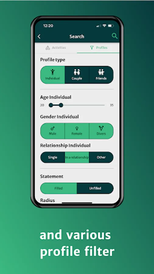 But the profile filter can do a lot more! With it you can filter by age, gender, relationship status and radius, because you are the one who decide what is best for you.