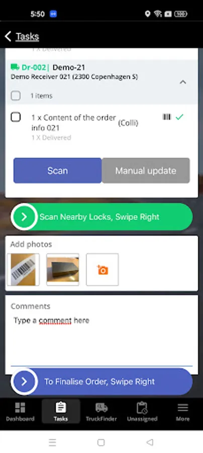 In the App, you can update, create, accept, or reject new tasks, as well as assign them to other drivers.
