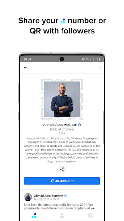 You get special Droplen number and QR to share with people who want to, also you will be able to disable direct calls or set a call price based on the value you believe you offer. then you receive voice calls from your fans with full privacy protection and time respecting.
