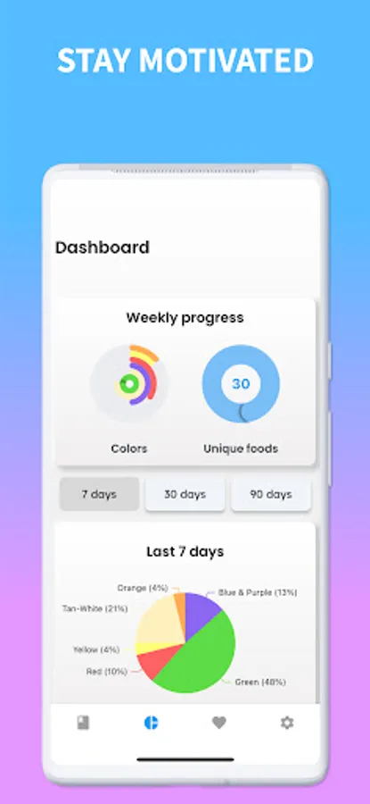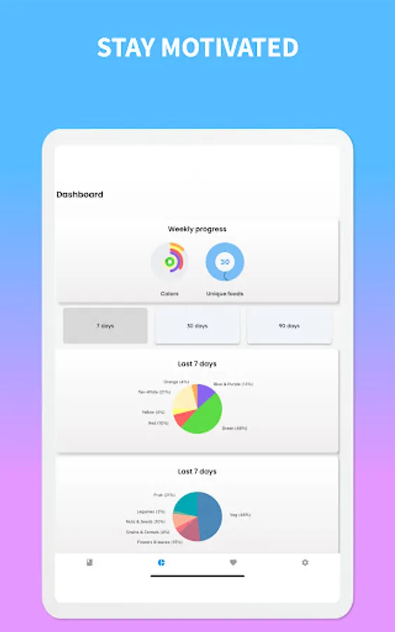 Our app helps you track your daily plant-based food intake and visualize your progress towards optimal nutrition. Unlock unicorn status by eating the rainbow each day or week, and earn gold stars as you reach your goals!