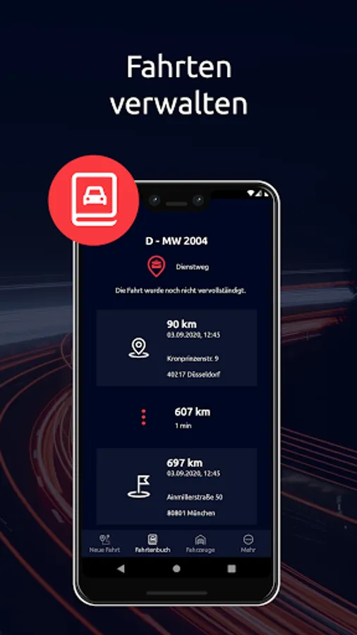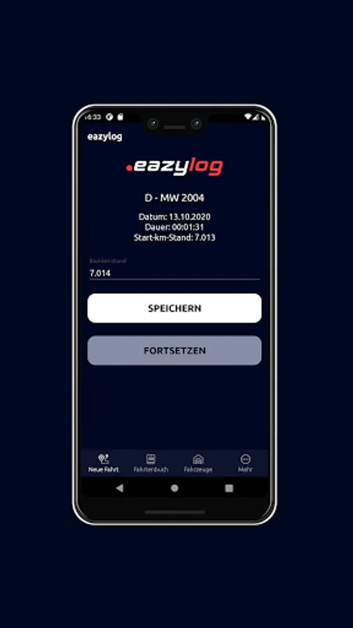 With the eazylog app you can easily record your trips. Start - stop - save and you're done. Start and end points as well as the route driven are recorded by GPS. The exact addresses are resolved automatically so that you have to do as little manual input as possible.