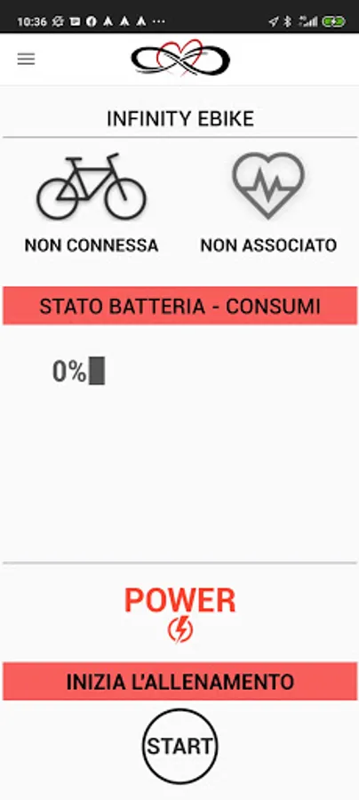In the operating screens of the Infinity Ebike App you can view the battery status in percentage and the watt hours used during the training session in order to better manage the total charge of your Ebike