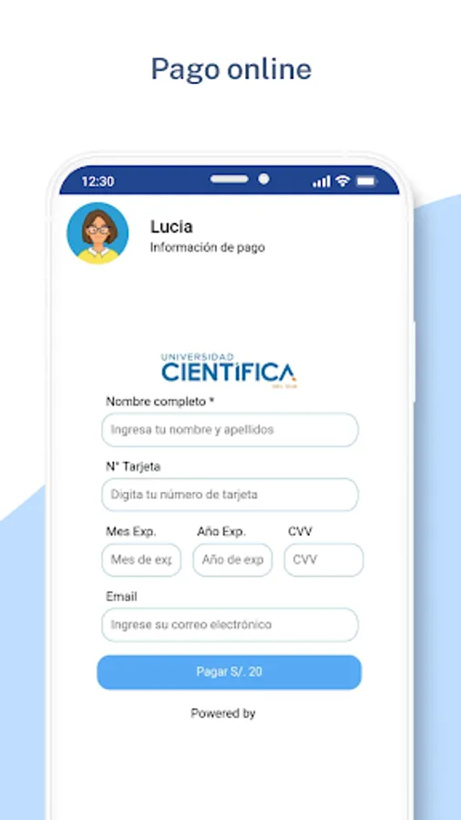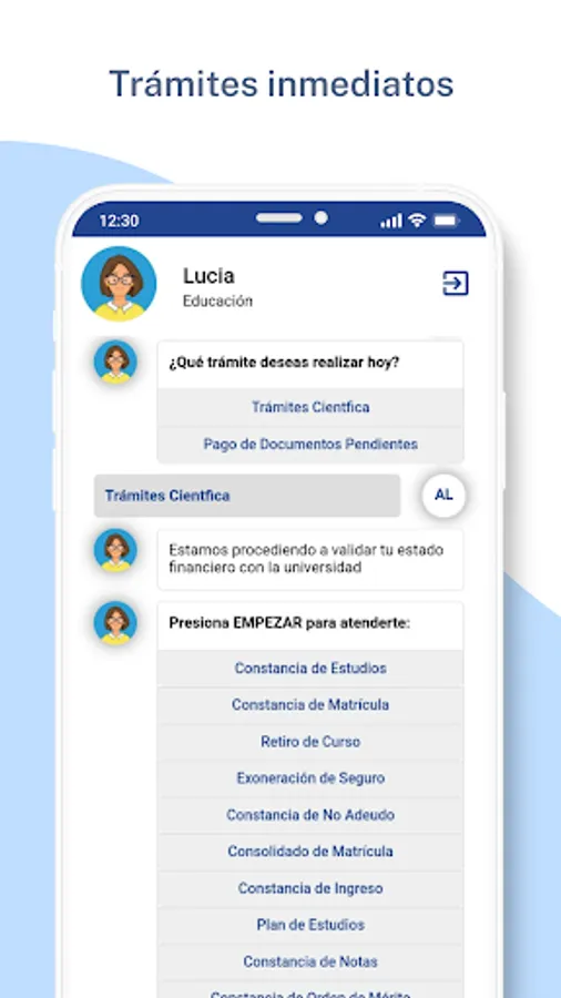 Lucía is our virtual assistant for students and applicants who will help you carry out different types of procedures (Proof of studies, registration, various certificates, payment of pensions, applications, insurance, etc.) and pay the pending charges.
