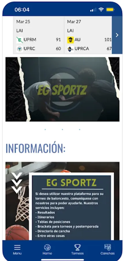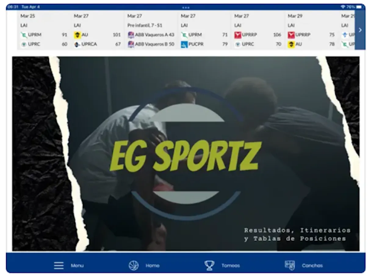 The EG Sportz app is created for the presentation of the results in the basketball leagues in Puerto Rico. We want to make it easy for all parents and fans to access games, scores, standings, and court directions. In it, the most updated results and position tables will be shared.