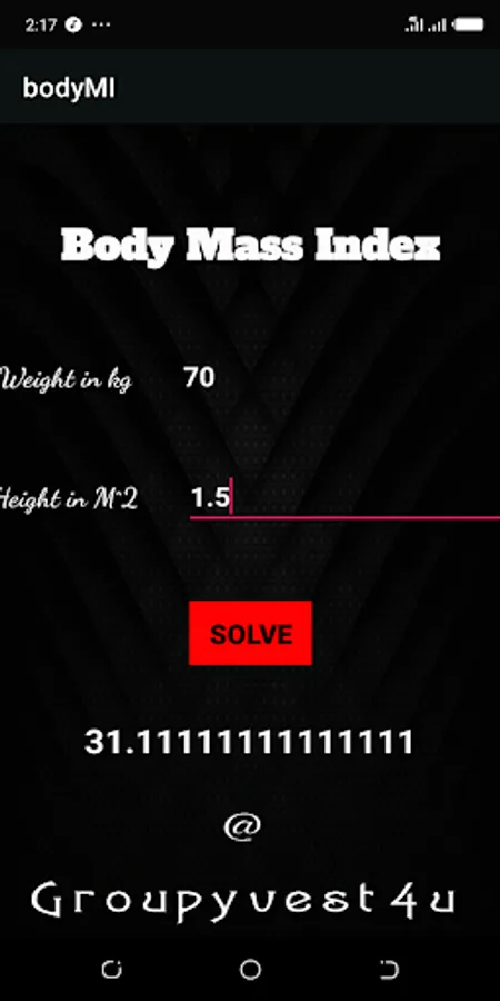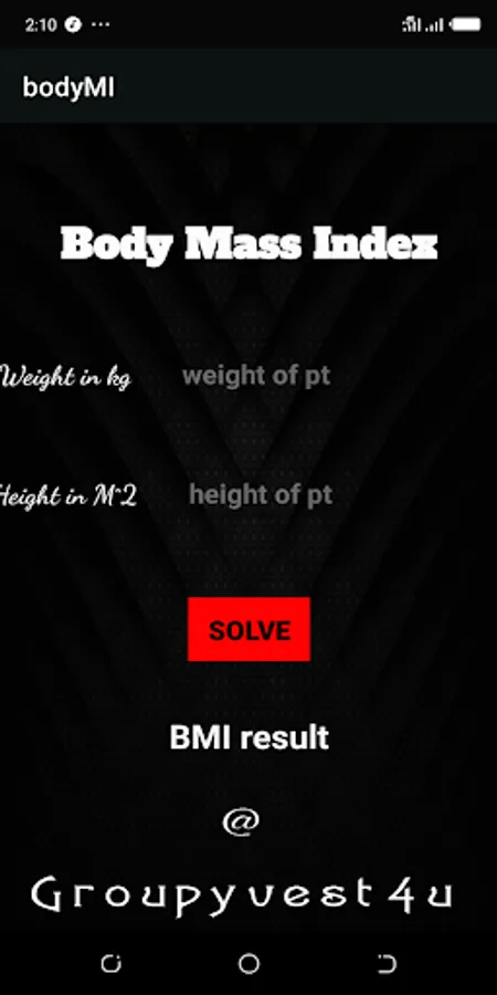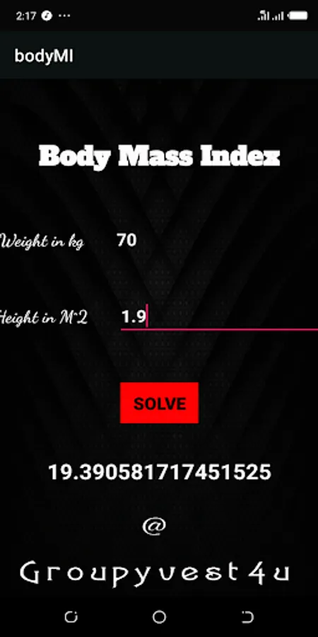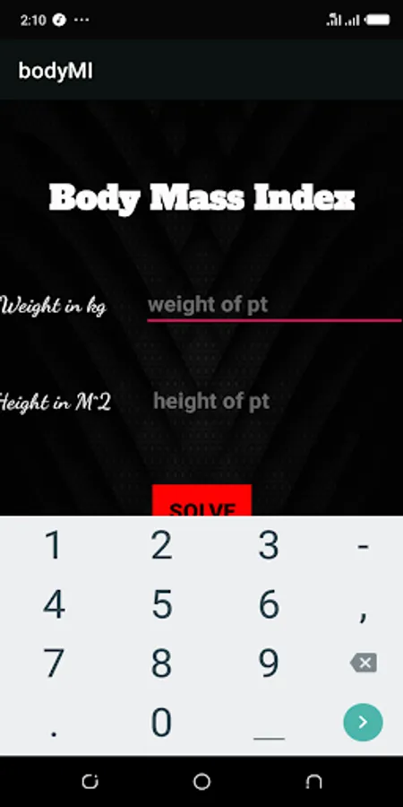 this is a simple to use medical app that uses the weight of an individual measured in kilogram and the height of the individual measured in meter square to determine the body mass index of an individual. can tell if an individual is underweight, normal weight or obese.
