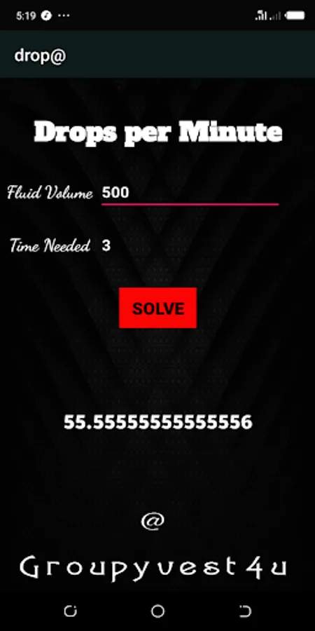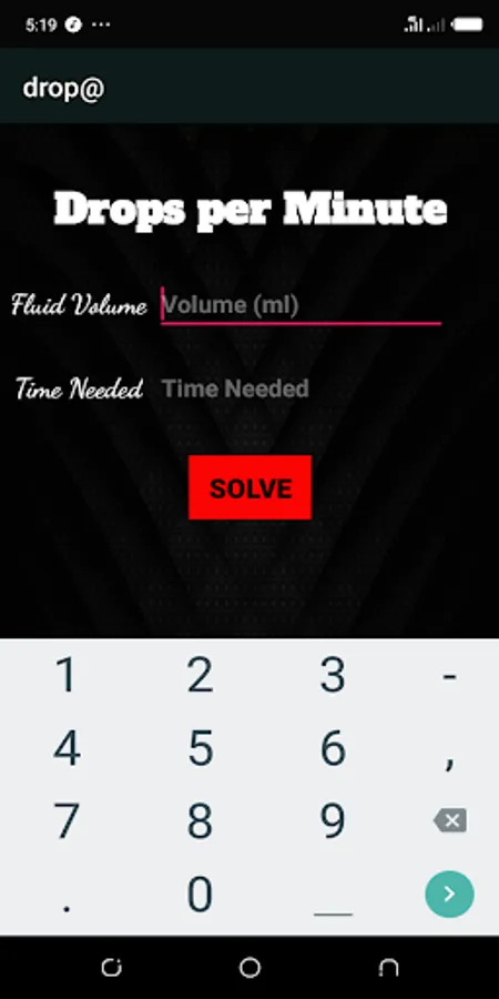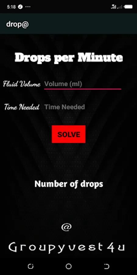 this is an easy to use app created to help facilitate the administration of intravenous fluid. uses the fluid volume and time required to determine the drops per minute with which the fluid must run