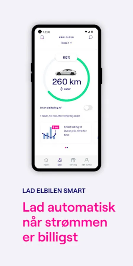 With the app you can charge the electric car smartly. elKompis is charging when the electrical prices are lowest. You save electricity costs. In addition, you get a full overview of your charges in the app and you can choose when the car shall be fully charged. With elKompis you can use smart charging with Tesla, Volvo, Audi, BMW, VW, Skoda, Jaguar, Porsche, Mini, Ford, Opel, Renault and Seat.