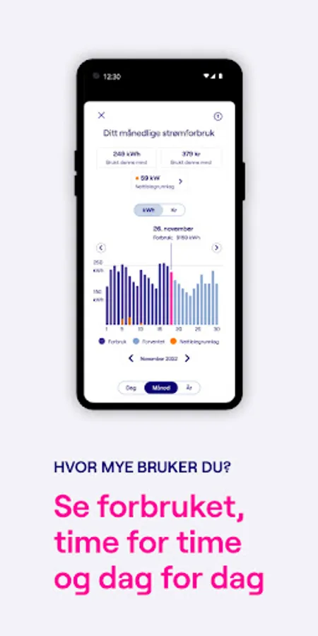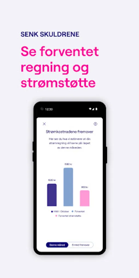 You get full control of your electricity consumption and prices. In the app you’ll be able to see your electricity prices by the hour and compare your consumption with similar homes. In addition, you will get the forecast over your expected electricity consumption and electricity bill for the next days and month. You can use this insight to reduce your electricity bill.