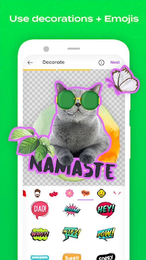 5️⃣ Decorate your stickers with emojis - our sticker maker studio has so many emojis to choose from. Want to make your meme stickers more fun? Simply add cool sunglasses to your cat stickers!