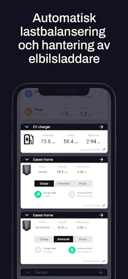 Enegic offers ready-made functions for power control of electric car chargers and is fully compatible with electric car chargers from Easee, Charge Amps, Monta and Zaptec. In the app, you can see information about how much power is available for electric car charging at any given moment. The available power space is also reported to the electric car charger via the cloud.
