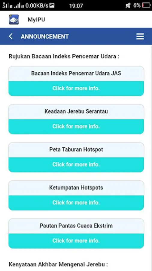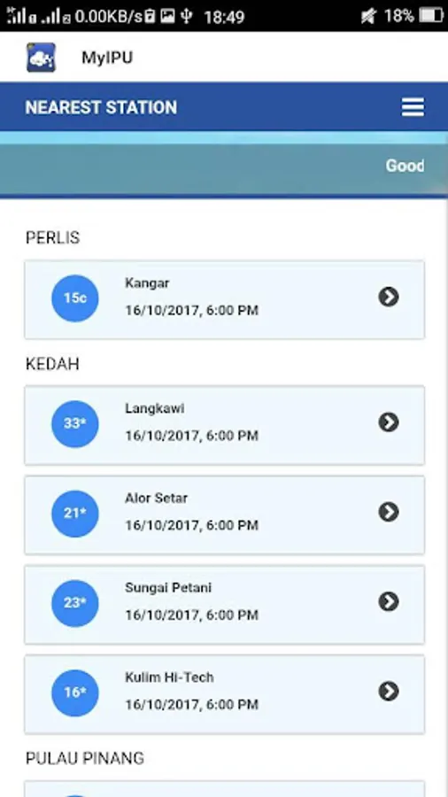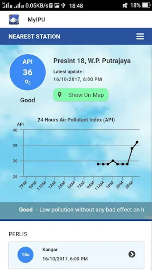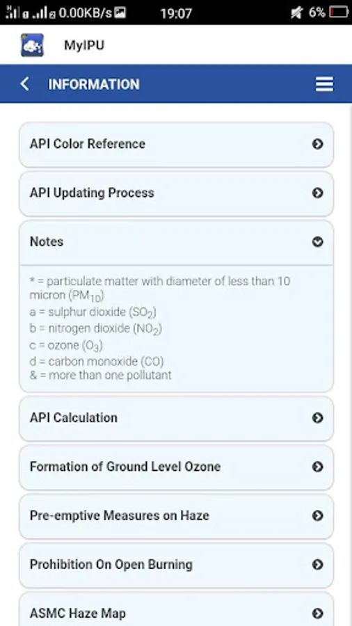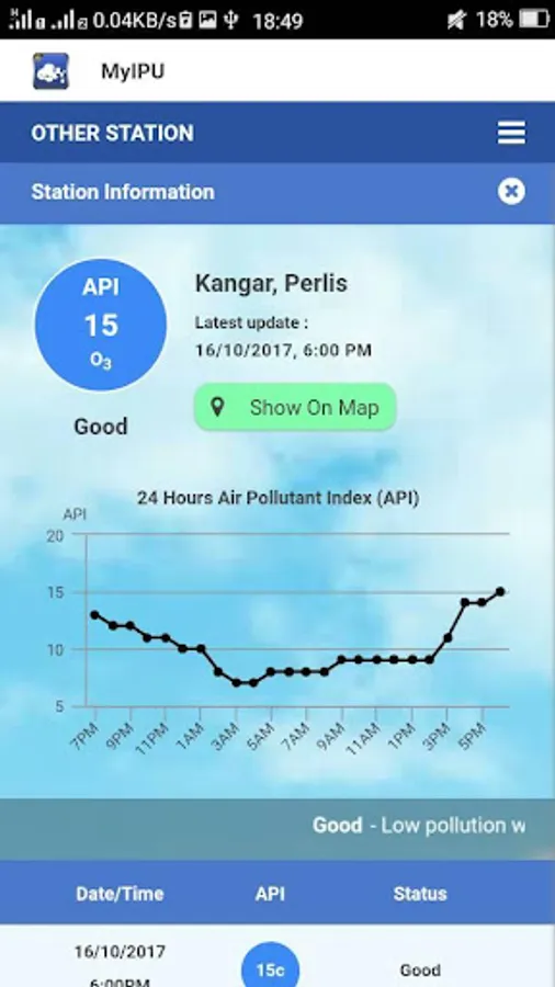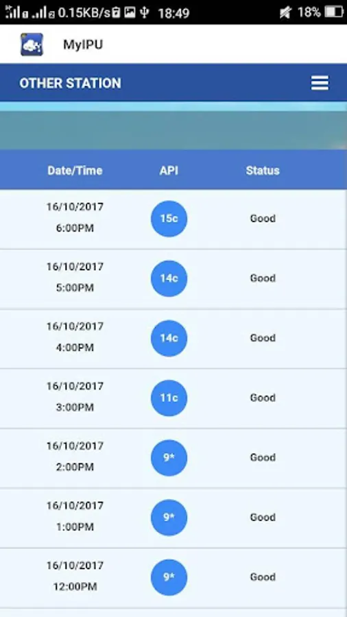 MyIPU is a mobile application that provide information of the latest API readings at Continuous Air Quality Monitoring (CAQM) stations in Malaysia, based on standard health classification.