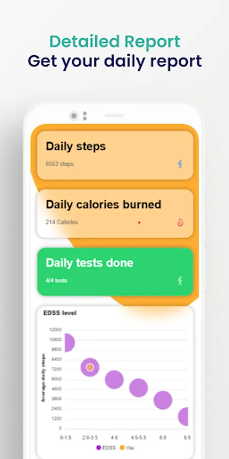 - Detailed Reports: Access detailed reports summarizing your daily activities. Review completed tests and those pending, represented by color-coded indicators. Additionally, gain insights into your step count, average speed, calorie consumption, and EDSS Risk level chart.