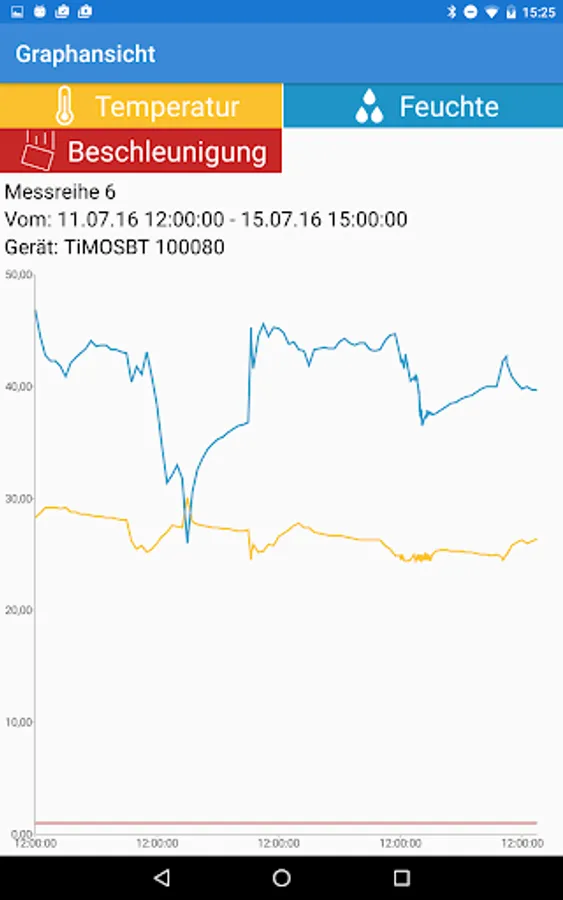 Nach Herstellung einer kabellosen Verbindung mit dem Gerät hat man Einsicht in die vom Gerät durchgeführten Messungen (mitsamt Schwellwert-Alarmen und Statistik-Werten). Außerdem können alle Messwerte heruntergeladen werden. Diese werden in graphischer Form präsentiert und können per email versendet werden.