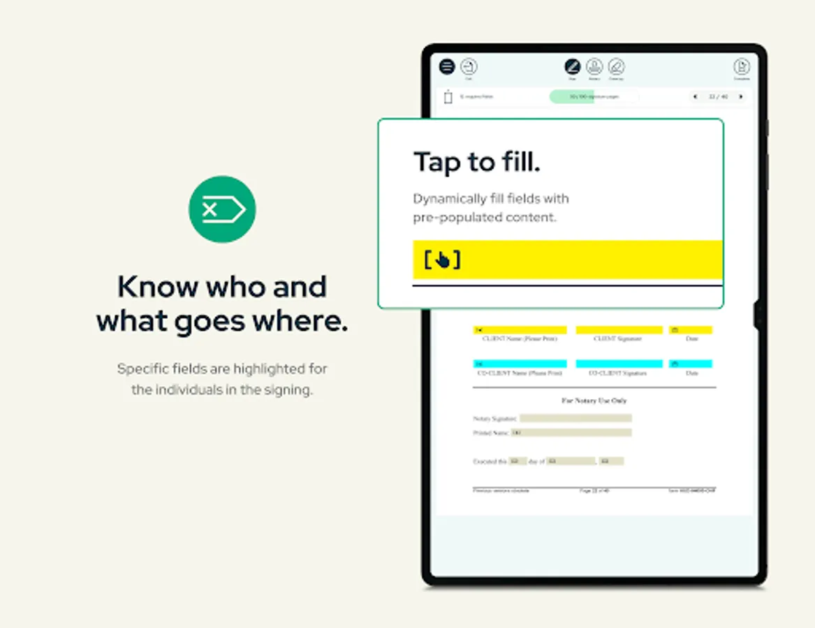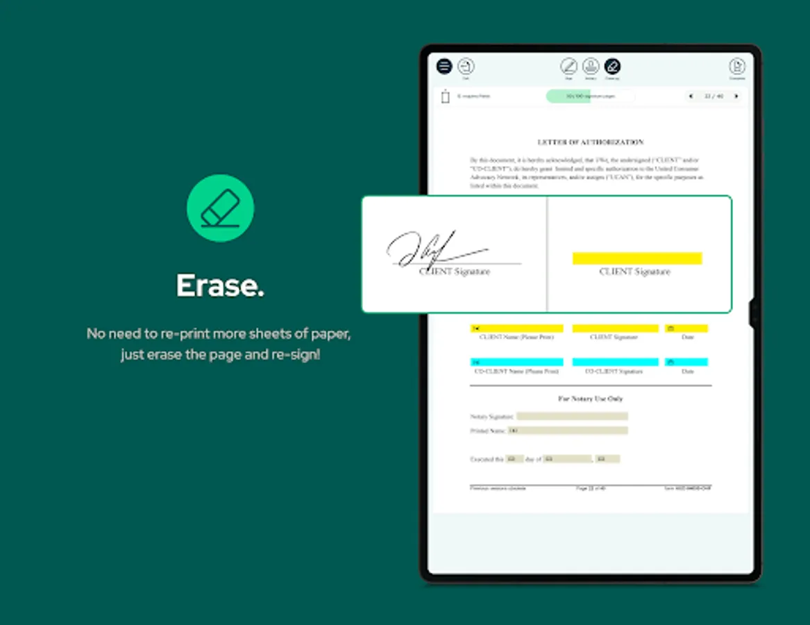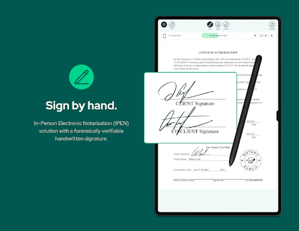 o The notary meets with the signor and both parties sign documents with their unique handwritten signatures using the tablet. Real time document edits can be made during the signing, just like paper.