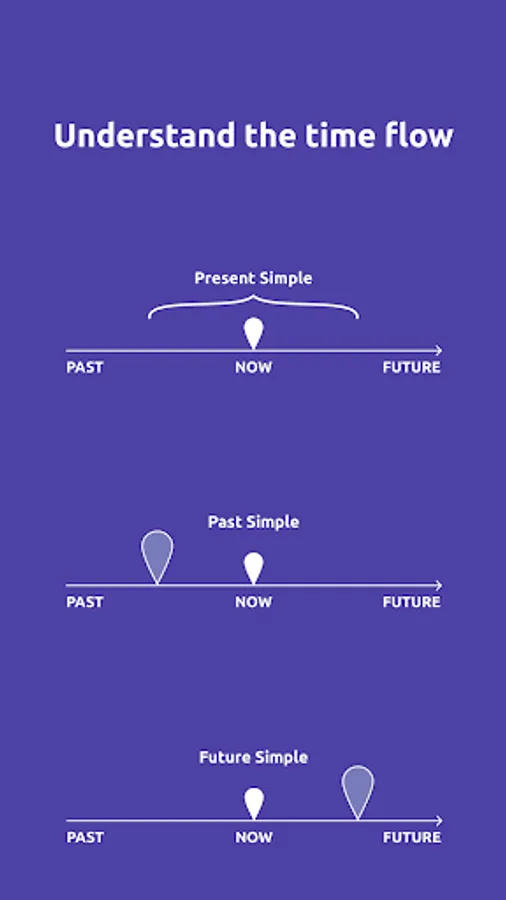 We explain each tense with a simple, animated timeline, where you can see how the past, the present, and the future are related to the time.