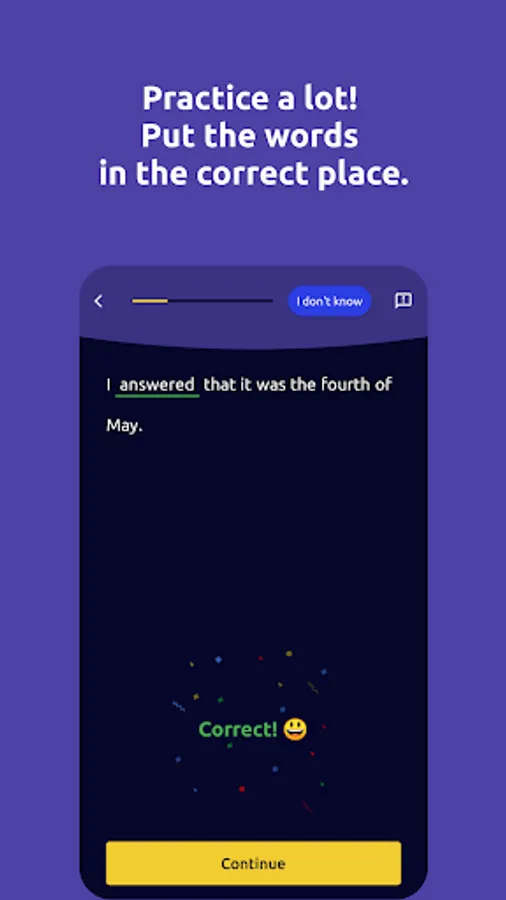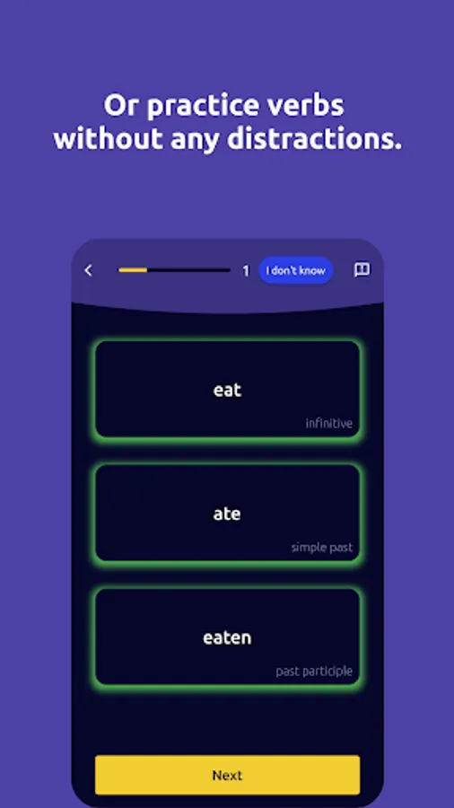 For the practice part, we used the reinforcement learning technique. It will help you memorize tenses and verbs quickly and for a longer time.
