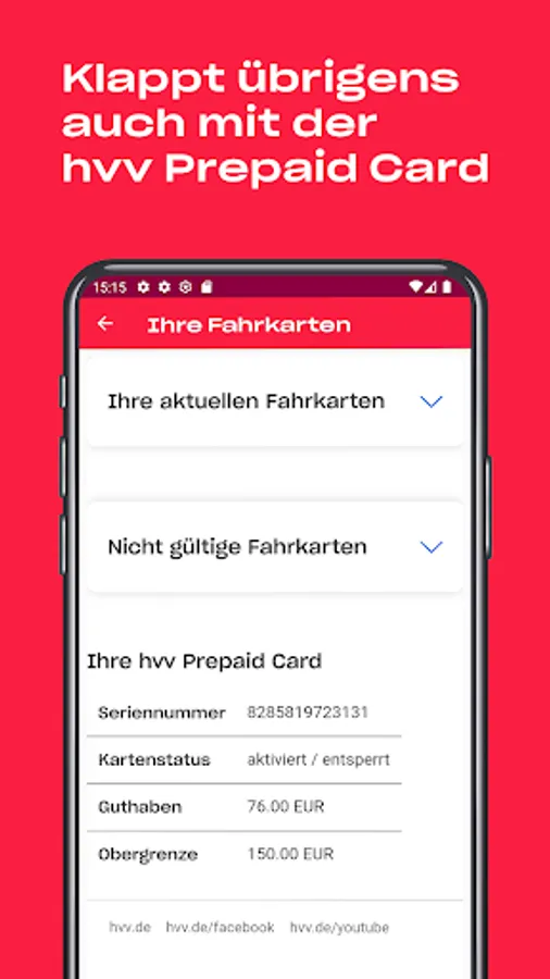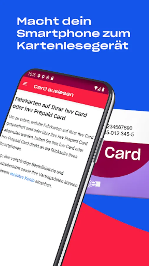Do you have an hvv prepaid card? You can also read these with the hvv Card Info app and an NFC-enabled smartphone. You can quickly and easily receive information about current and no longer valid tickets or the balance on your hvv prepaid card.