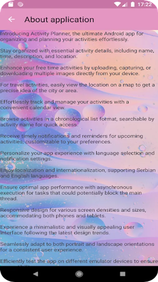 Introducing Activity Planner, the ultimate Android app for organizing and planning your activities effortlessly.Stay organized with essential activity details, including name, time, description, and location.Enhance your free time activities by uploading, capturing, or downloading multiple images directly from your device.For travel activities, easily view the location on a map to get a precise idea of the city or area.Effortlessly track and manage your activities with a convenient calendar view.Browse activities in a chronological list format, searchable by activity name for quick access.Receive timely notifications and reminders for upcoming activities, customizable to your preferences.Personalize your app experience with language selection and notification settings.Enjoy localization and internationalization, supporting Serbian and English language.