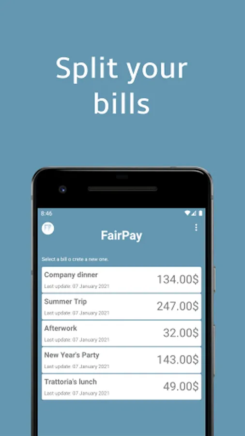 FairPay allows you to split your invoices and calculate what each participant must pay according to the amount of each product consumed.