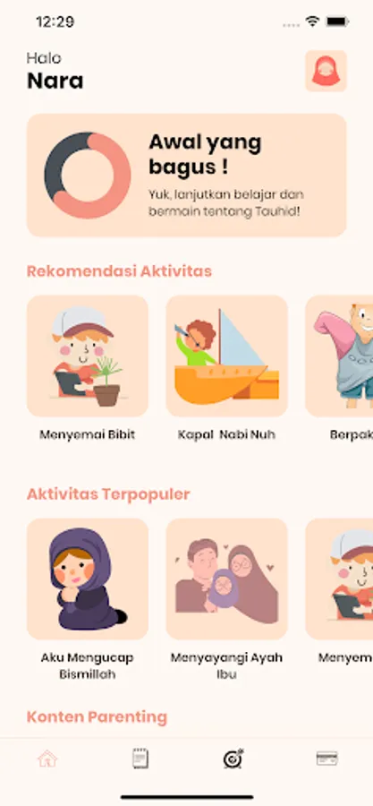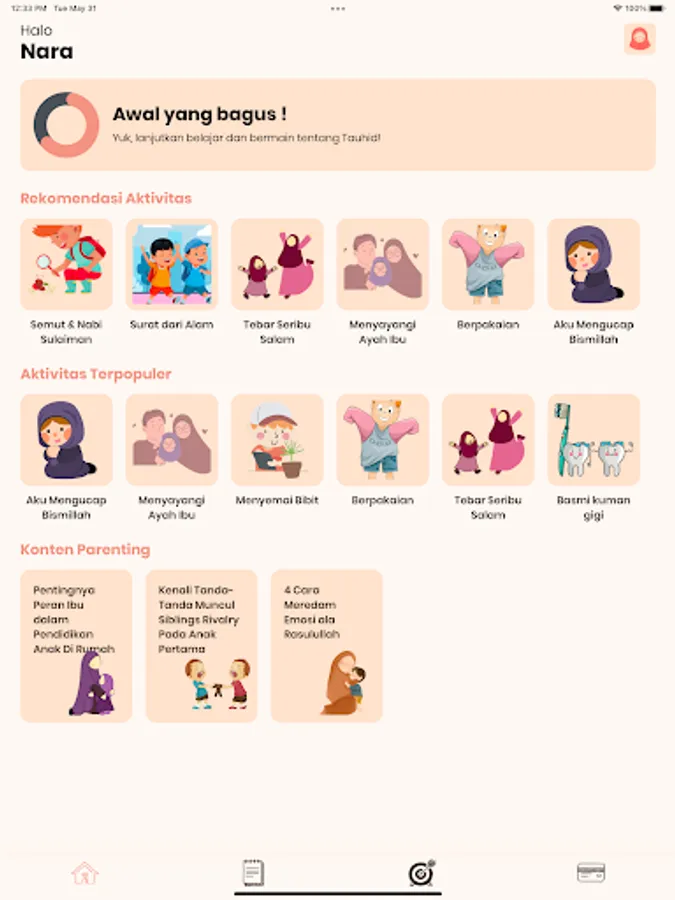 Guidelines for implementing a children's education system at home using the Koran-based play and learning by experience methods by providing guides, learning packages, and interactive games at every stage of a child's development.