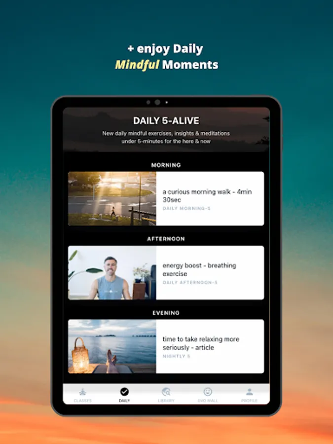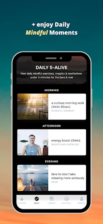 Every day we'll send you 3 x new daily mindful moments to complete. One for the morning, afternoon and evening. These bite-size activities may include short breathing exercises, meditations, interesting articles, and mindfulness insights and theory. Perfect to help you stay connected and feeling your best every day!