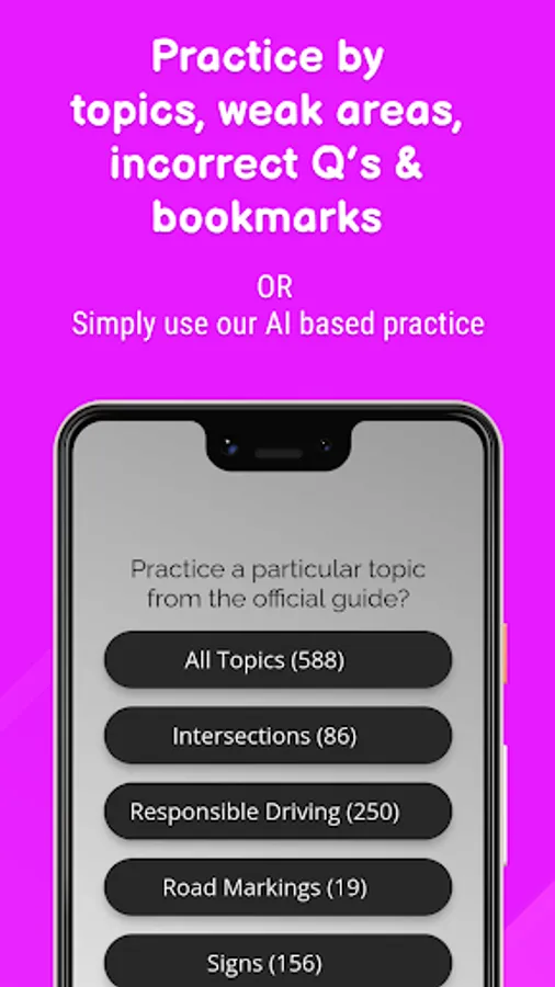 Whether you're a new driver or just need a refresher, our driving test practice app with personalized AI learning is the perfect tool to help you pass your test with ease in your first attempt. Download now and start studying!