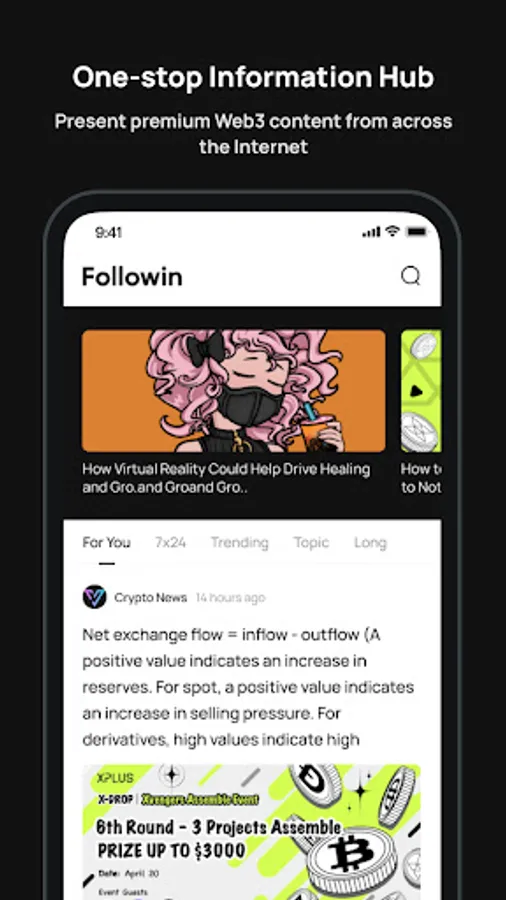 Followin aggregates global blockchain news, integrated with automatic translation and algorithm which provides personal feeds based on your interest.