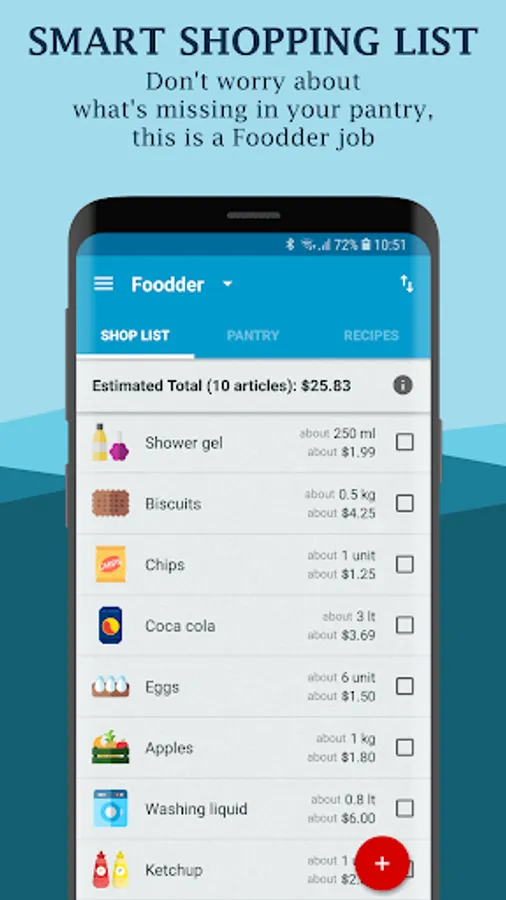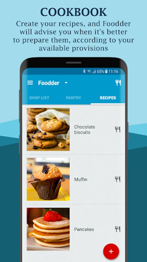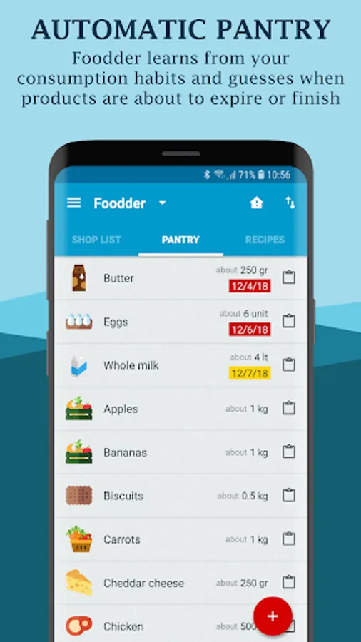Foodder allows you to organize your shopping and your pantry. It helps you create the weekly shopping list, and reminds you expiring products that would be better to consume, so you will never waste food again. Furthermore, using recipes you can optimize the use of the available products in your pantry, and plan your daily menu*.