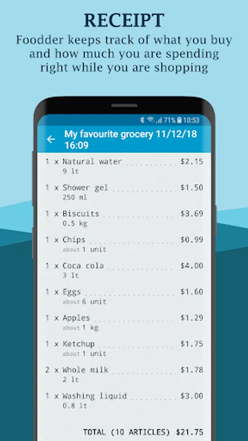 Foodder prepares your virtual receipt while you are shopping, so you will always have the shopping cart under control and, if you have also provided prices, you will know the total amount of your shopping.