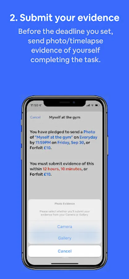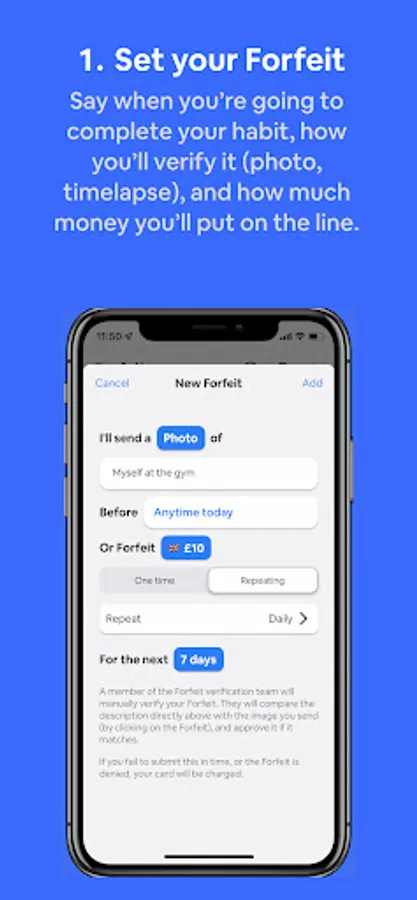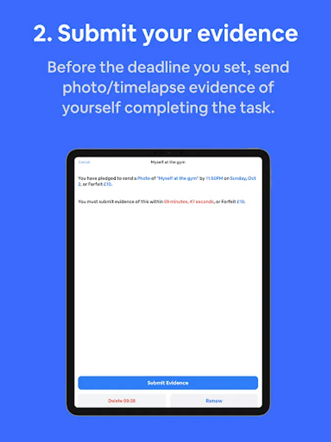 You say what you're going to do, when you're going to do it, and how much money you'll lose if you don't do it. You must send photo/timelapse evidence by the time limit, or we take your money.