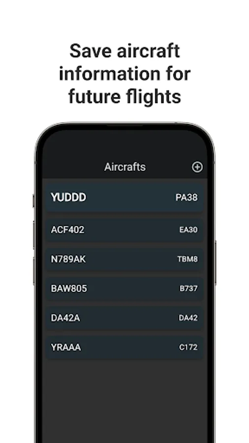Start by clicking the “+” icon in the top right corner on the Aircrafts tab. Edit the form, save and the app will remember your aircraft for