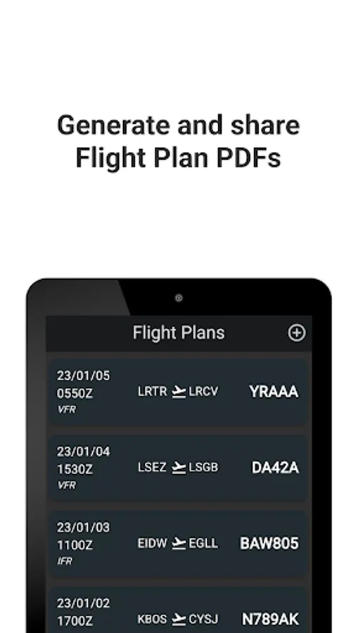 Add your first flight plan by clicking the “+” icon on the Flight Plans tab. Form is divided into 3 sections. Select your aircraft from the