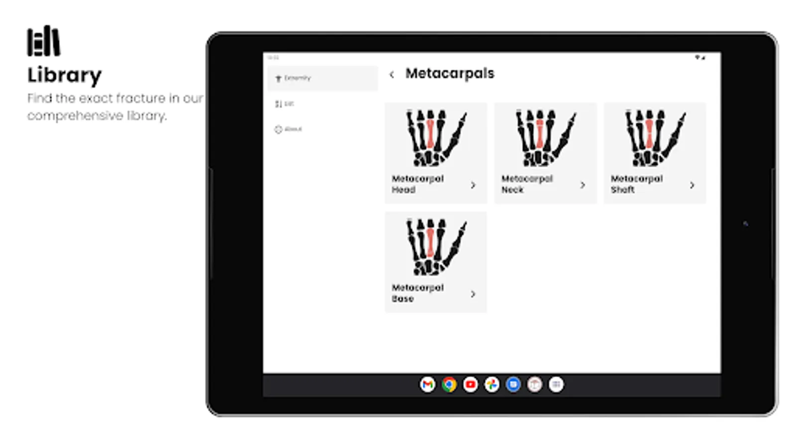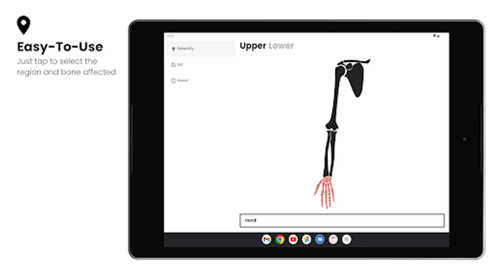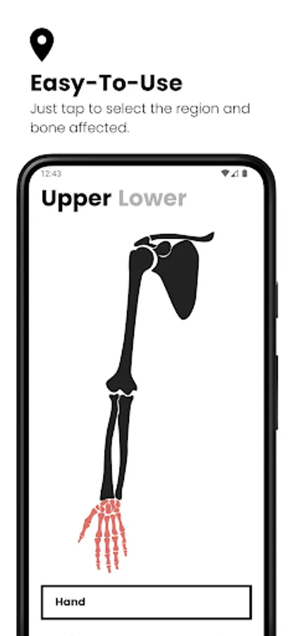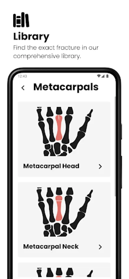 - Easy-to-use interface: Use our bone map to select the injured region and get a selection of fractures. You can also search through a comprehensive list with just a keyword.