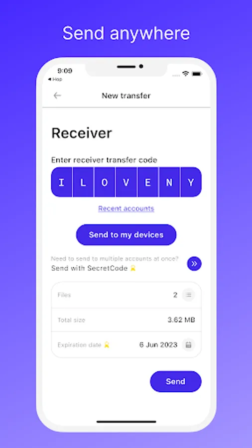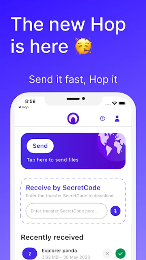 Say goodbye to tedious messages with cumbersome links for file sharing. With Hop, all you need is your personal code to swiftly send and receive files hassle-free.