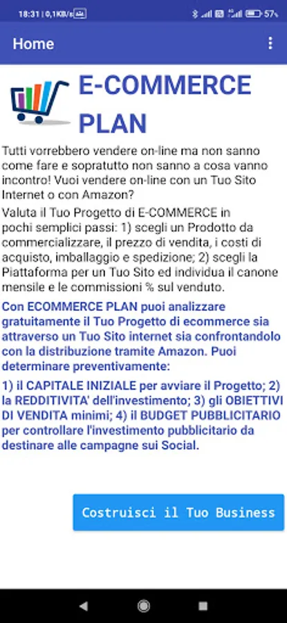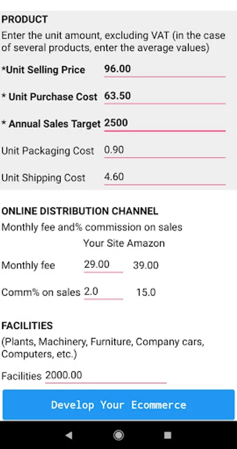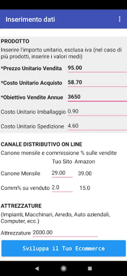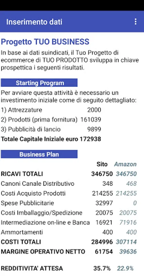 You can develop your e-commerce project quickly, entering only three data input of your product: 1) unit sales price; 2) unit purchase cost; 3) annual quantity target that you plan to sell. In fact, to speed up and support your analyzes, you will find some pre-compiled data that can also be freely modified and customized. Finally, you can share in an instant, the pdf report of your project through the applications of your smartphone.