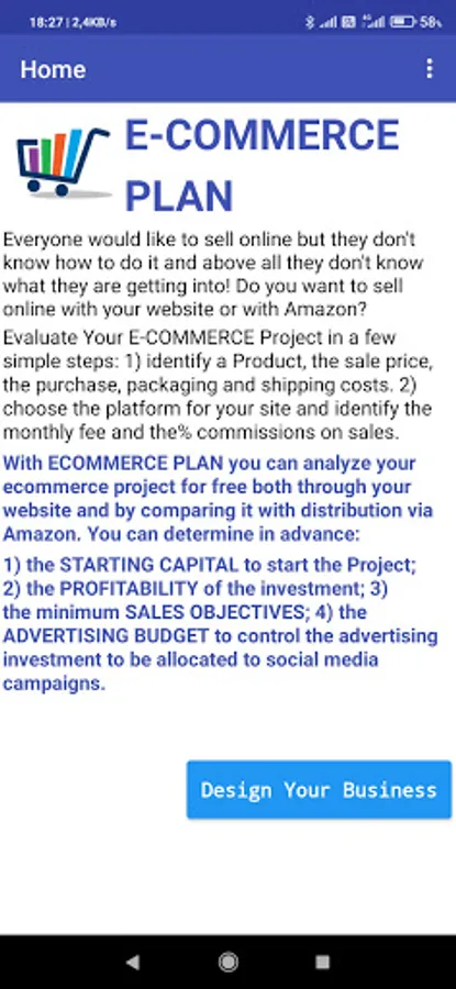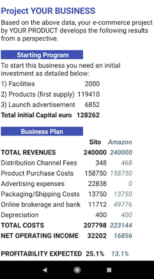 With ECOMMERCE PLAN you can analyze your ecommerce project both through your website and by comparing it with distribution through Amazon. You can determine in advance: 1) the STARTING CAPITAL to start the Project; 2) the PROFITABILITY of the investment; 3) the minimum SALES OBJECTIVES; 4) the ADVERTISING BUDGET to control the advertising investment to be allocated to social media campaigns.