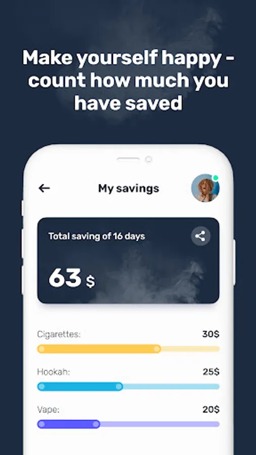 Tracking progress - track your progress in quitting your bad habit. How much you have saved, how many cigarettes you haven't smoked and how long you are now living without a cigarette. You can also share your progress with your friends.