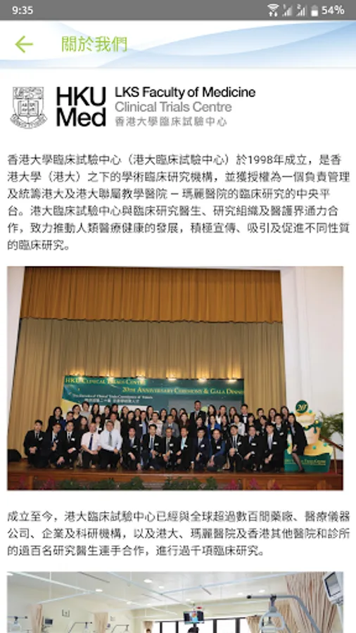 Established in 1998, The University of Hong Kong Clinical Trials Centre (HKU-CTC) has coordinated over a thousand clinical research projects over the past two decades, through which a lot of patients in Hong Kong and the general public worldwide have been benefited. Taking you as our priority, HKU-CTC launches the first mobile application. This application is a convenient platform for you to get access to the latest information about clinical research and healthcare, and to stay in contact with us in advancing human healthcare together.