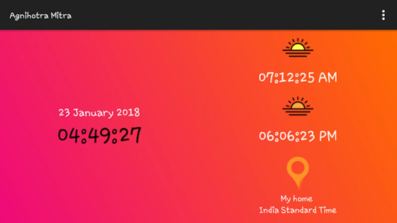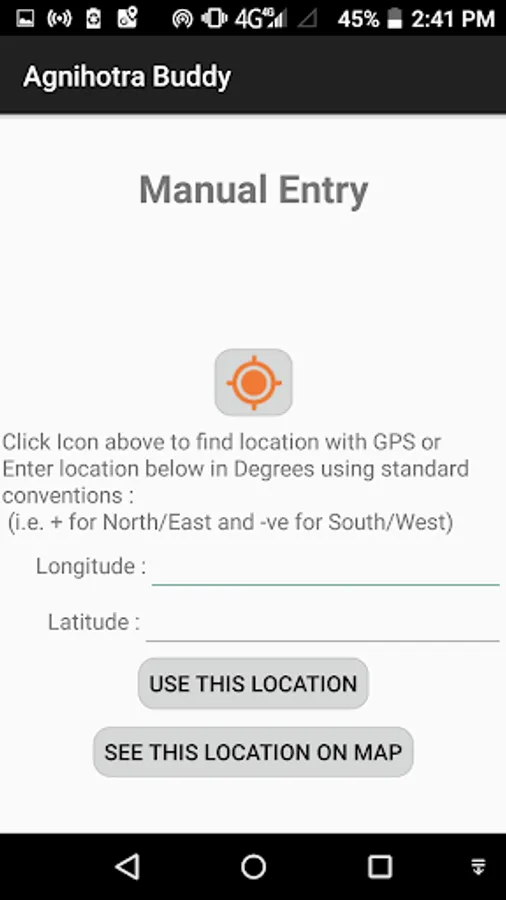 Agnihotra Buddy will help you get accurate Agnihotra timings for sunrise and sunset based on your location. Either you can make use of GPS location with Google Maps or else manually enter the location to get timings. The app uses the official website www.homatherapie.de for downloading timings. The timing calculations are extremely accurate for best results with Agnihotra. The timings need to be downloaded only once for each location and then the app will work offline for the remainder of the year. You may store timings for up to 3 locations and can delete or rename locations too.
