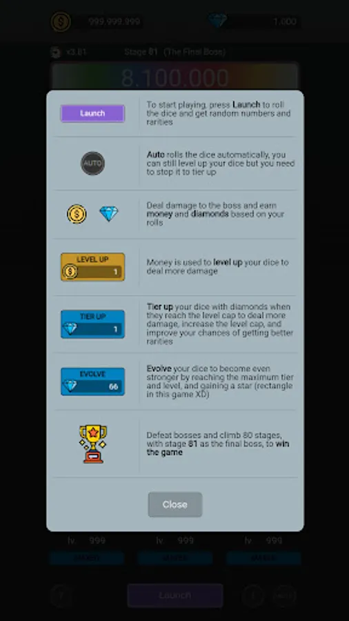 Remember: the road to victory is not easy. You'll have to work hard, defeat increasingly difficult monsters, and find the right combinations of numbers and rarities. But if you're lucky enough, you can become the best player of "Dice Evolution 81 - Idle Game". Good luck!
